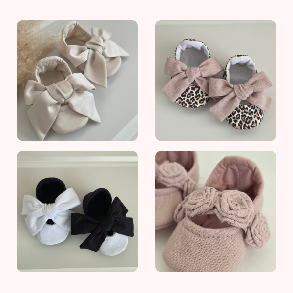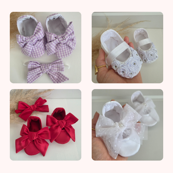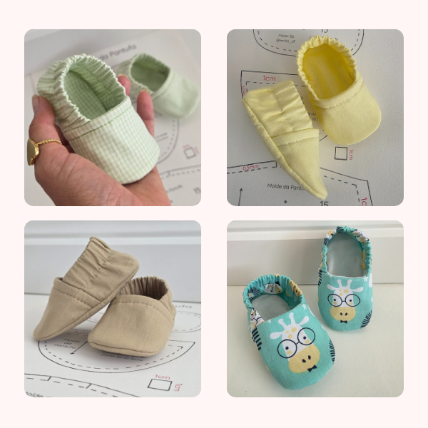 Além das aulas, você receberá dois moldes exclusivos — o sapatinho de bebê e a pantufa — para criar peças idênticas às das fotos abaixo.